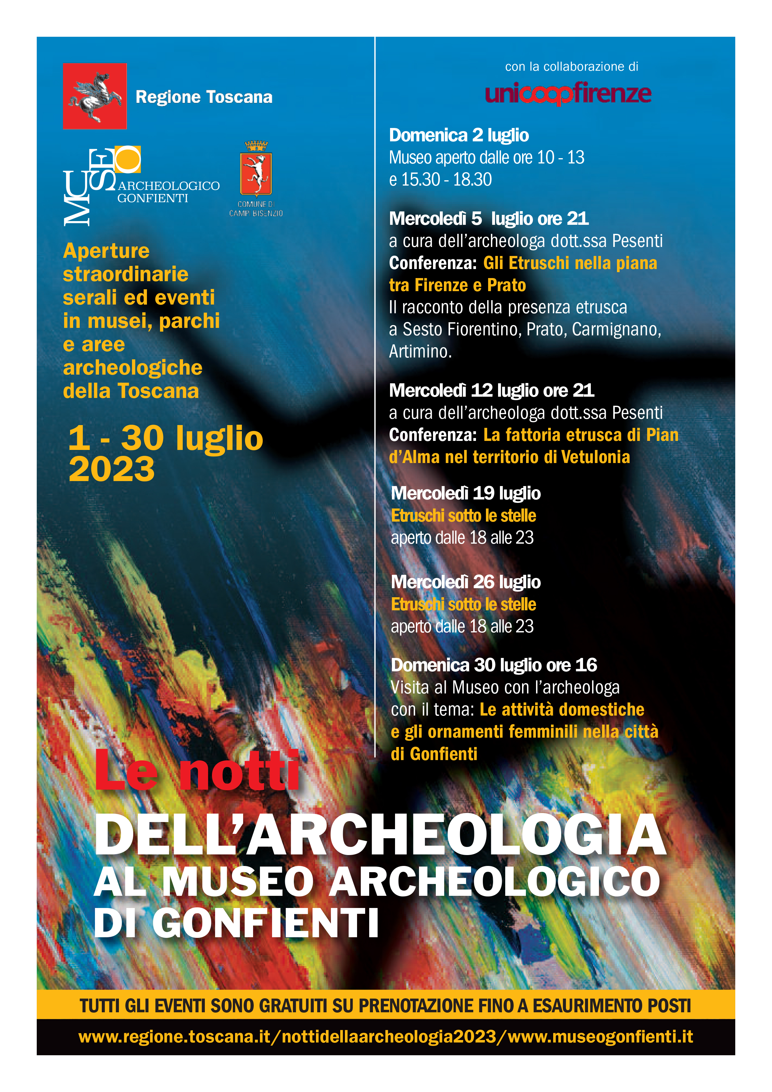 Per tutto il mese di Luglio tornano "Le Notti dell'Archeologia". Il Museo archeologico di Gonfienti, nell’ambito della rassegna promossa dalla Regione Toscana, ospita due conferenze sugli Etruschi nella Piana fiorentina e pratese fino alle testimonianze etrusche delle terre intorno a Vetulonia. Tutti i mercoledi di Luglio il Museo sarà aperto dalle 18 alle 23 per consentire la fruizione dei reperti archeologici in orario serale. In accordo con il tema proposto per le iniziative, l'attenzione al benessere nel corso del tempo e delle culture, il 30 Luglio avrà luogo la visita : Le attività domestiche e gli ornamenti femminili, testimoniati dai reperti rinvenuti nella grande casa di Gonfienti.